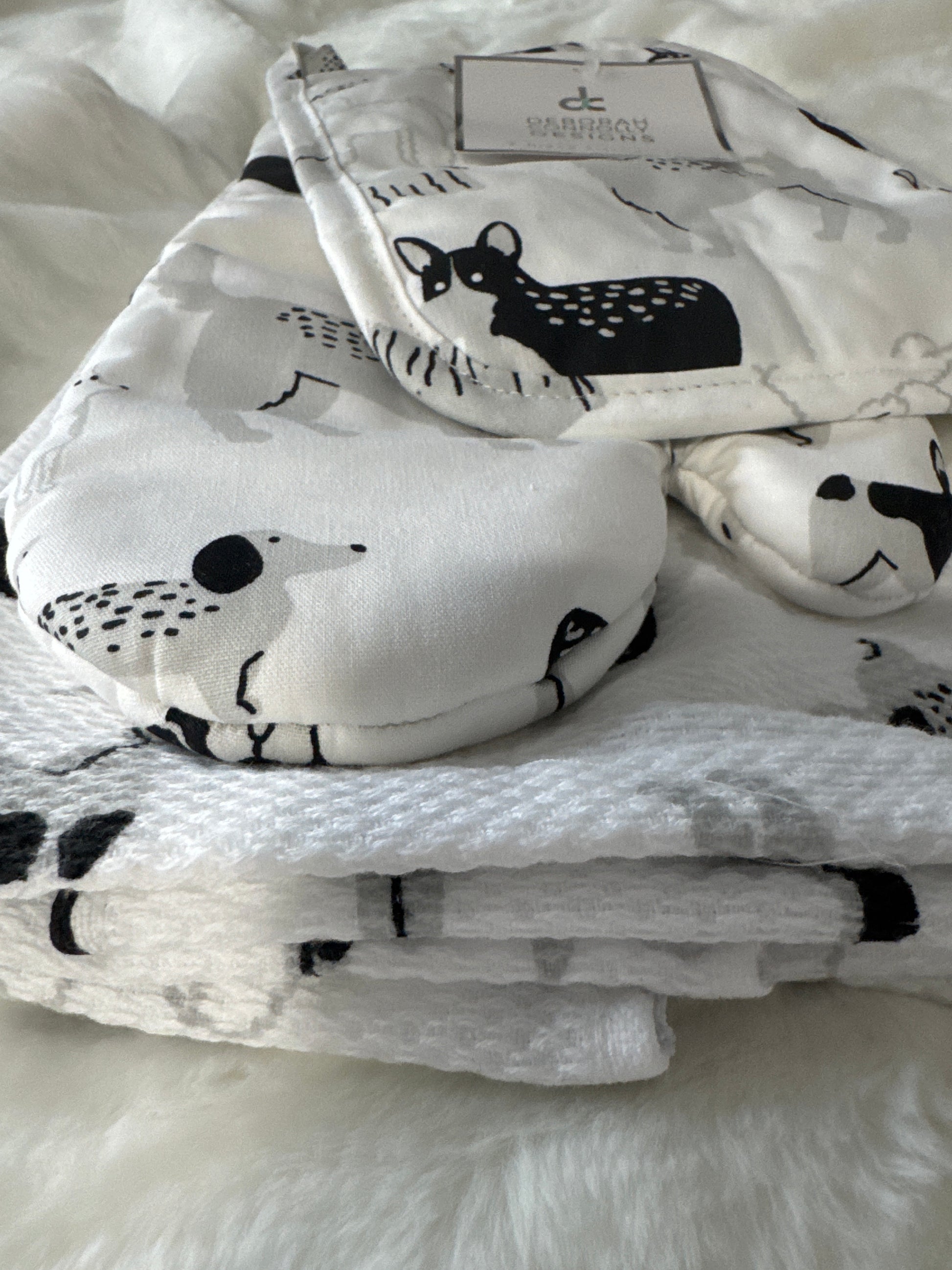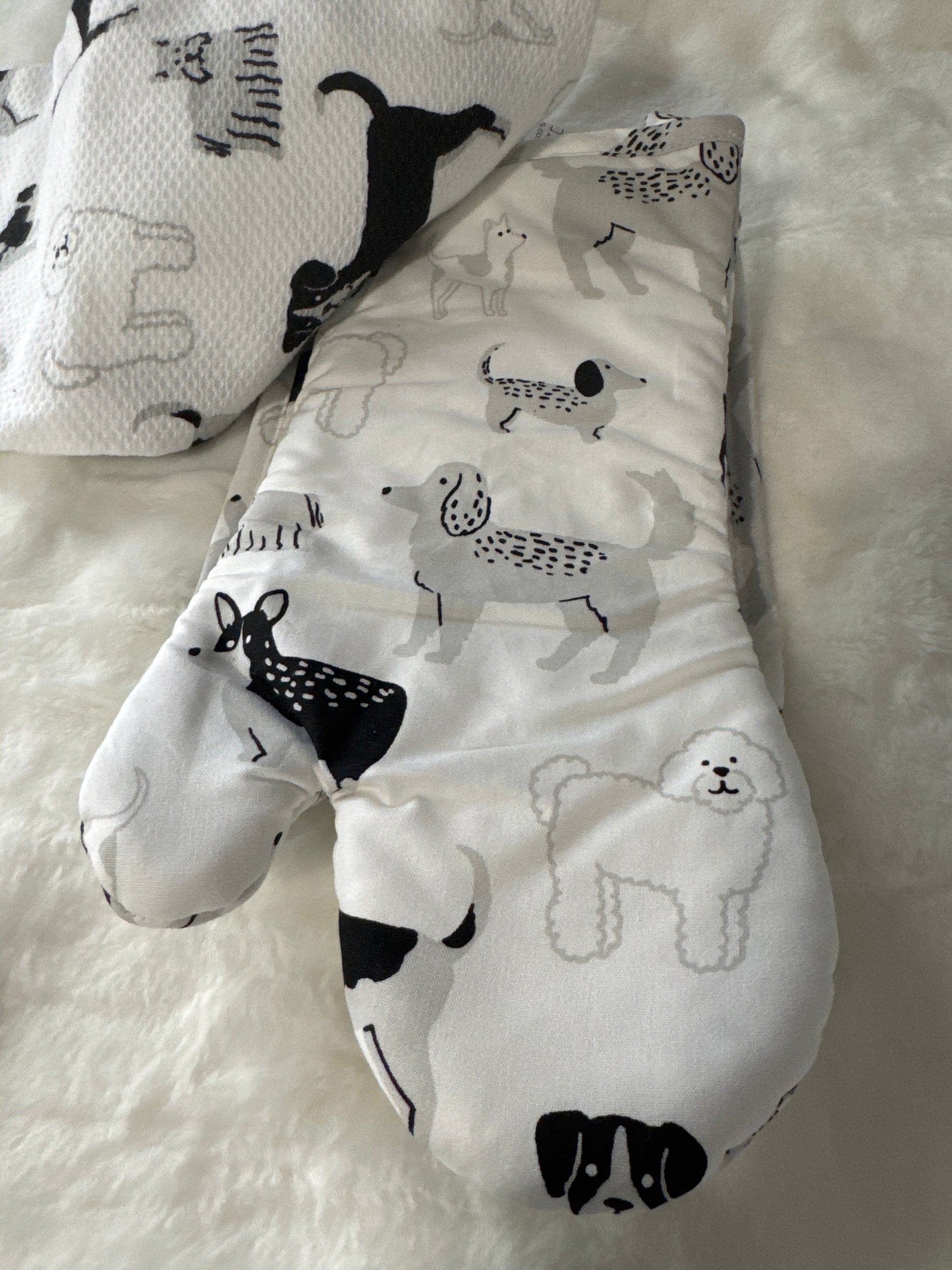3pc Dog Design Kitchen Set – Towel, Oven Mitt & Pot Holder | 100% Cotton