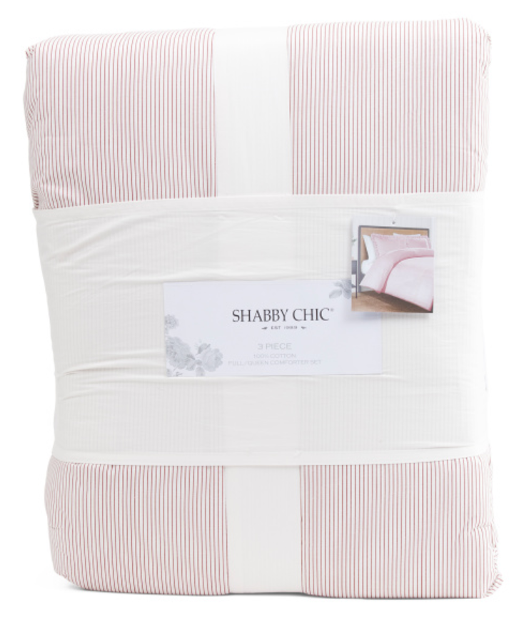 This striped ruffle cotton comforter set adds a soft, romantic touch to the bedroom with its classic red pinstripe pattern and delicate ruffle trim. Made from breathable cotton with a lightweight polyester fill, the comforter provides comfortable warmth while maintaining an airy, inviting feel. The king set includes one generously sized comforter and two matching king shams, creating a cohesive and polished bed presentation. Designed for everyday use, this bedding set is machine washable and easy to care for, making it suitable for year-round styling in traditional, farmhouse, or shabby-inspired interiors.