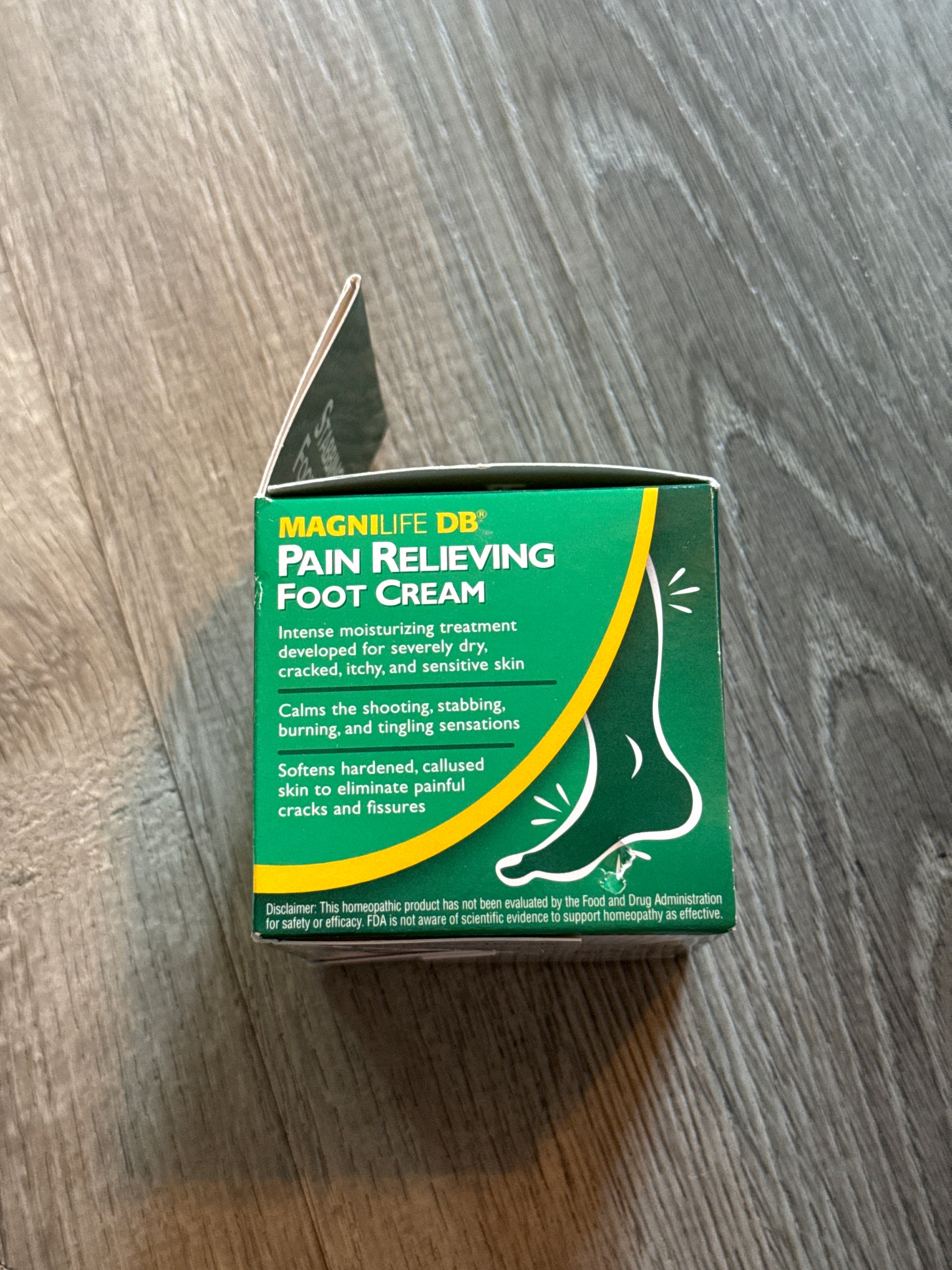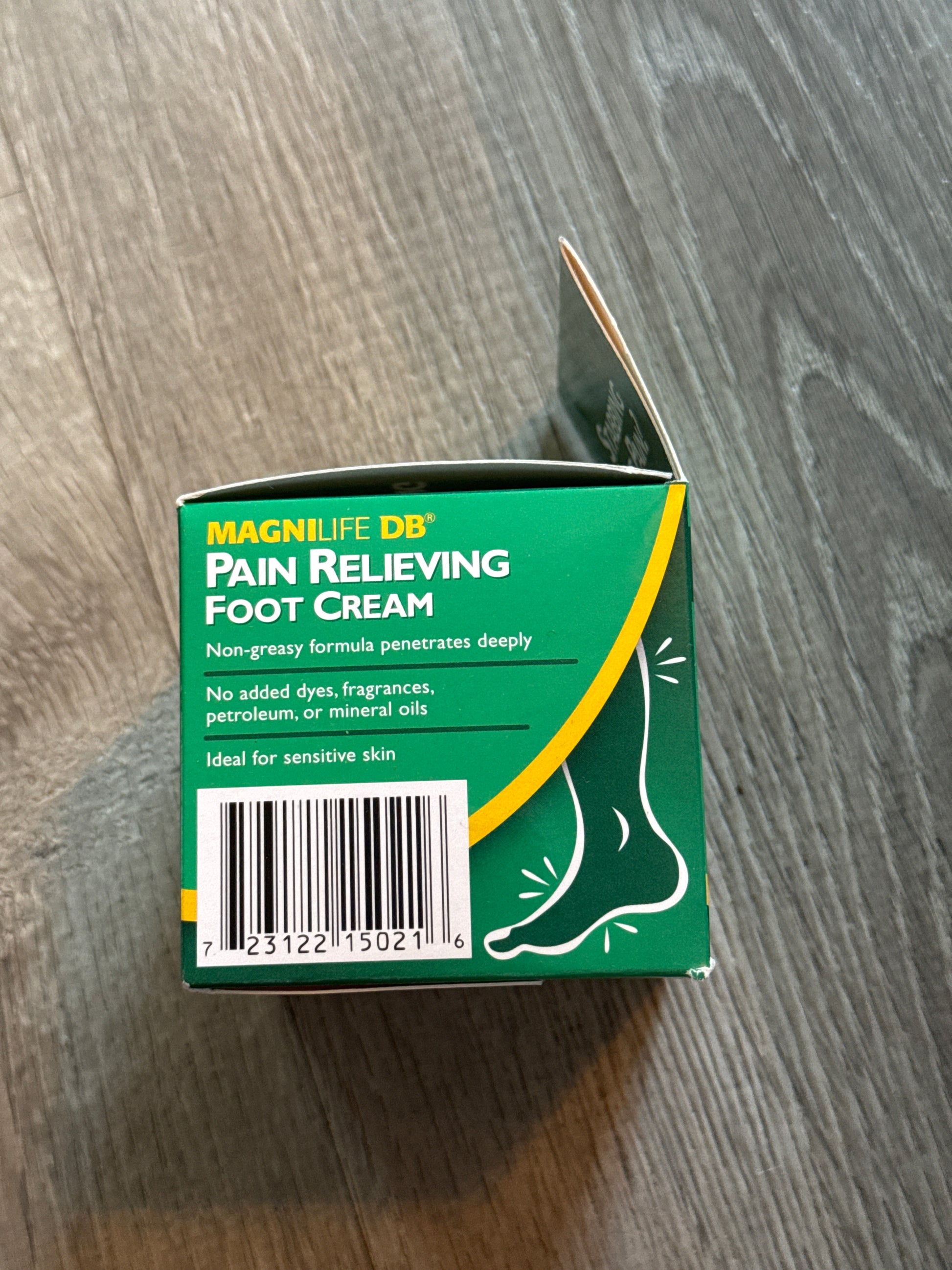 Magnilife DB pain relieving foot cream 4 oz Say goodbye to foot discomfort with Magnilife- the leading foot cream recommended by industry experts. Using our scientifically-formulated ingredients, Magnilife DB pain relieving foot cream provides long-lasting relief for muscle and joint pain. Enjoy walking without feeling any discomfort.
