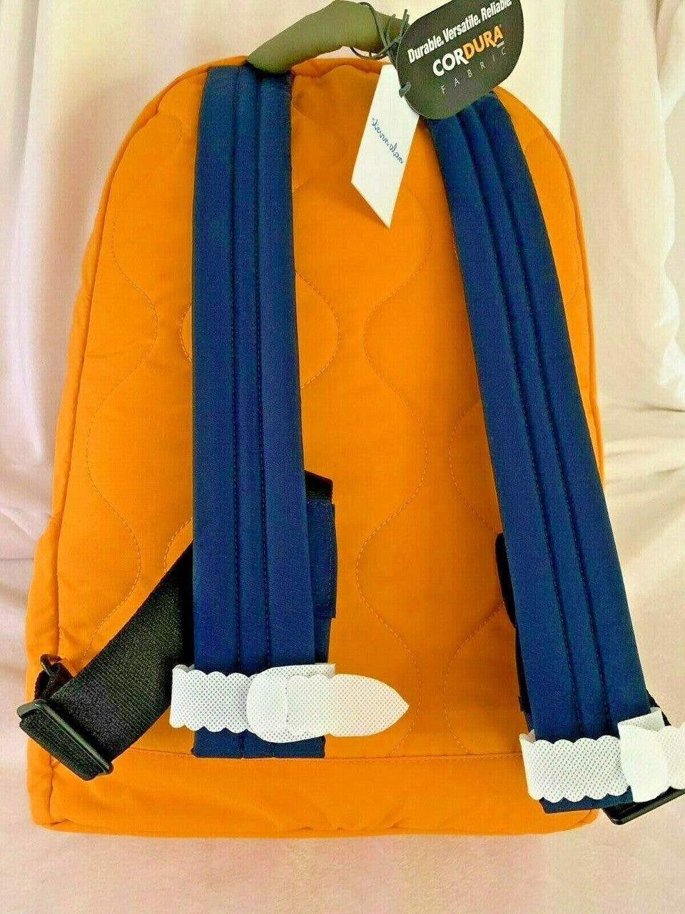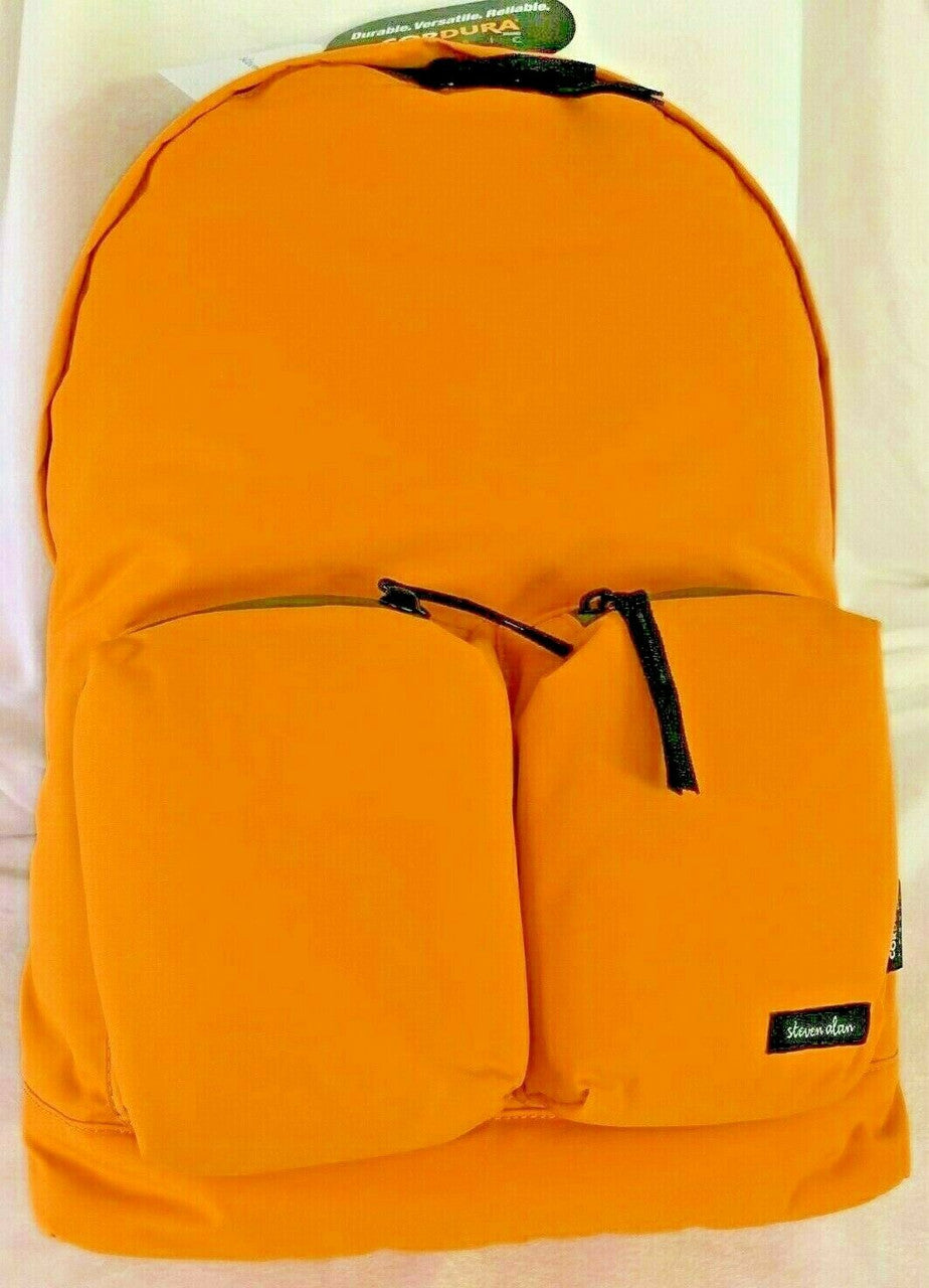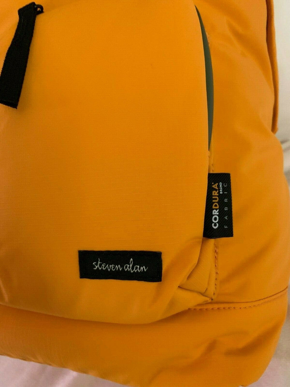 Steven Alan's Miles backpack is crafted of yellow durable ripstop tech fabric detailed with green zippers and navy straps. Logo patch at front. Two zip patch front pockets. Quilted, padded back. Matte black hardware. Lined with black fabric. Zip pocket and padded laptop pocket at interior. Rolled green fabric handle. Adjustable navy padded fabric and black webbed fabric backpack straps. Two-way zip-around closure. 18" height x 12" width x 7" depth (approximately). 2" handle drop (approximately).