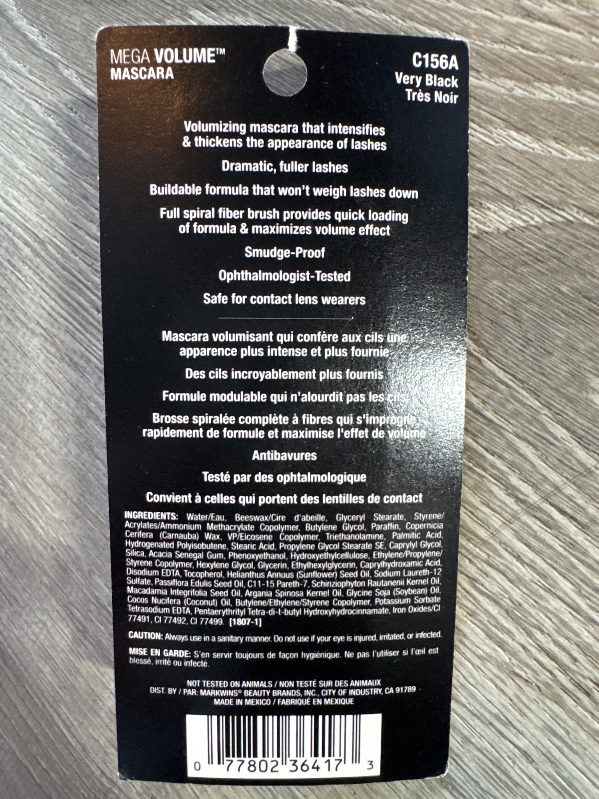 Wet n Wild Mega Volume Mascara C156A Very Black ~ BRAND NEW - SEALED